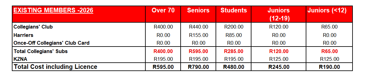 - Collegians Harriers- Existing Members 2026 Fees and ASA Licence Costs